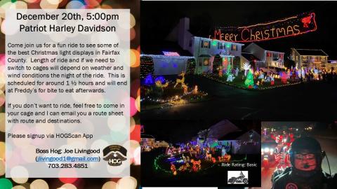 Come join us for a fun ride to see some of the best Christmas light displays in Fairfax County.  Length of ride and if we need to switch to cages will depend on weather and wind conditions the night of the ride.  The is scheduled for around 1 ½ hours and will end at Freddy’s for bite to eat afterwards.