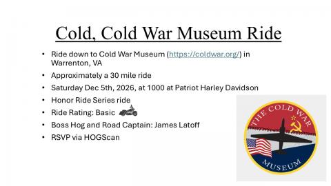 Ride down to Cold War Museum (https://coldwar.org/) in Warrenton, VA. Short distance but will include some backroads.