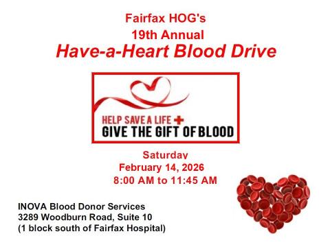 Fairfax HOG Presents the 18th Annual Have-a-Heart Blood Drive.  Sat, Feb 14th, 2025 from 8:00 am to 11:45 am.  Join us at INOVA Blood donor Services to give "A Gift of Life".  INOVA Blood donor Services is located at 3289 WoodBurn Rd., Suite 10, Annandale, VA 22003 (Just north of the intersection of Gallows Rd. and I-495, one block south of Fairfax Hospital off Gallows Rd.).