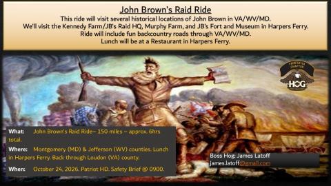 Ride to Harpers Ferry, WV, to include stops at historical locations relative to John Brown's raid on the Federal Arsenal in 1859. Stops include: Raid HQ (MD), Murphy Farm (WV), and John Brown's Fort (WV). Lunch in Harpers Ferry area before return trip to PHD.