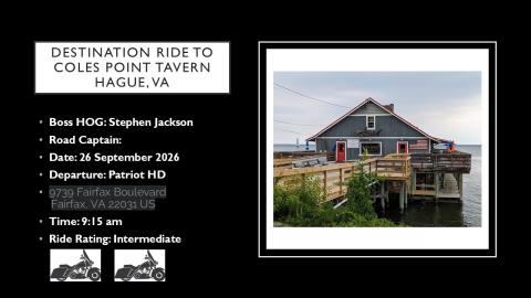 This is a destination ride along Virginia's scenic Middle Neck to Cole's Point Tavern for lunch, then back to historic Carl's Soft Serve in Fredericksburg for desert.