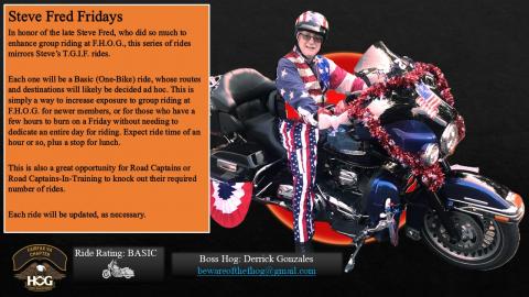 In honor of the late Steve Fred and his "T.G.I.F." ride series, these rides will continue the tradition of a relaxing group ride that focuses on group riding and community. Each ride is a destination ride and will end at a different lunch spot.