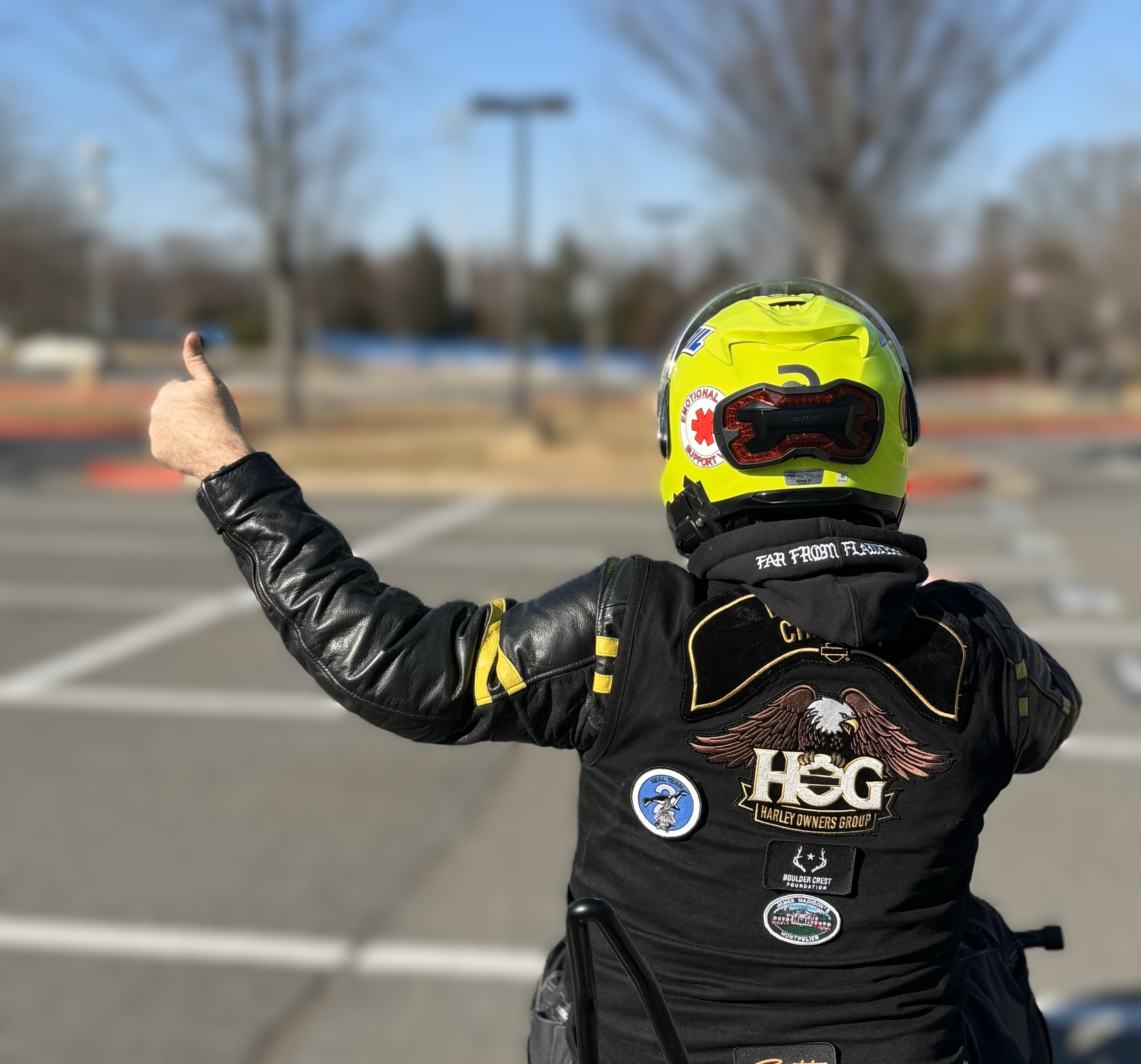 Left arm raised straight up from the body with the left hand showing just the index finger extended, slightly over the helmet.