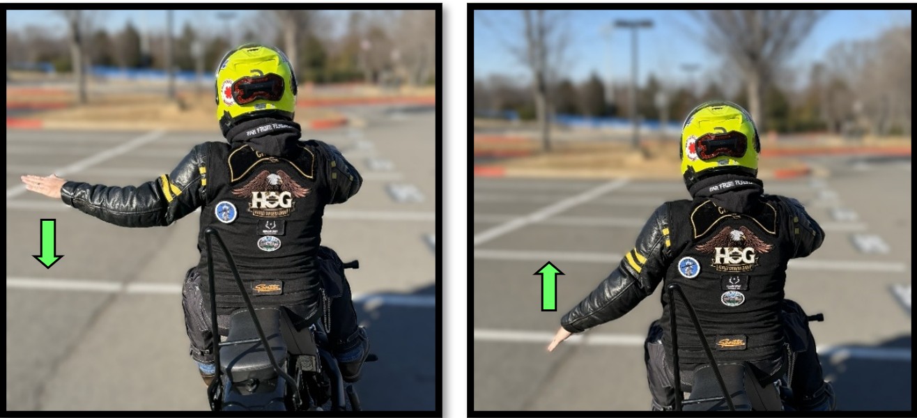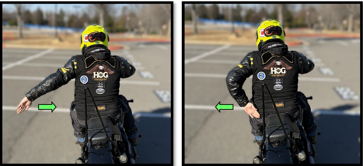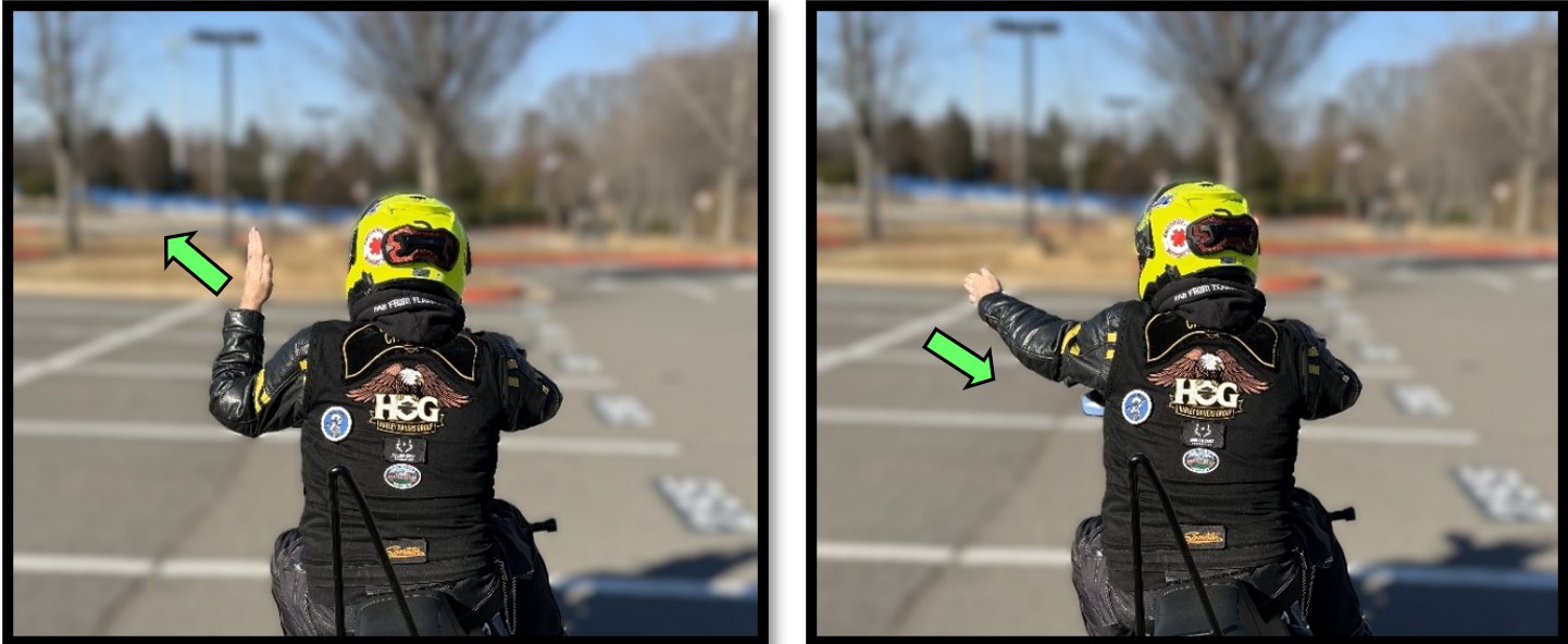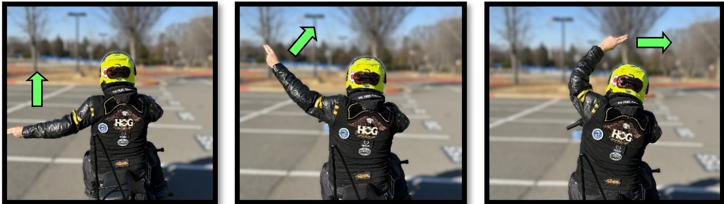 Large, smooth, sweeping action by the left arm to either the left or the right. The Road Captain provides this signal to change lanes.