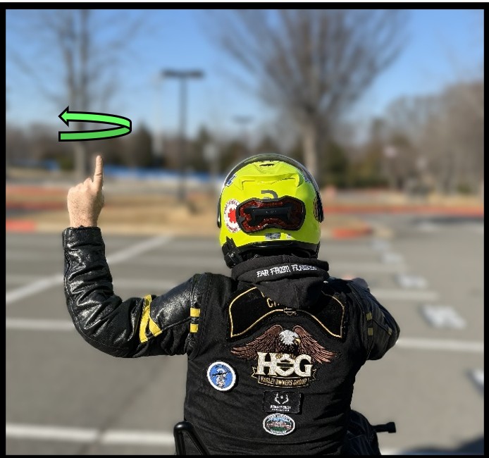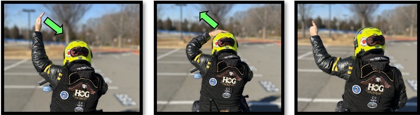 For path-of-travel lane risks, left arm and index finger extended over the head, moving in and out by bending out the elbow at a smooth pace.