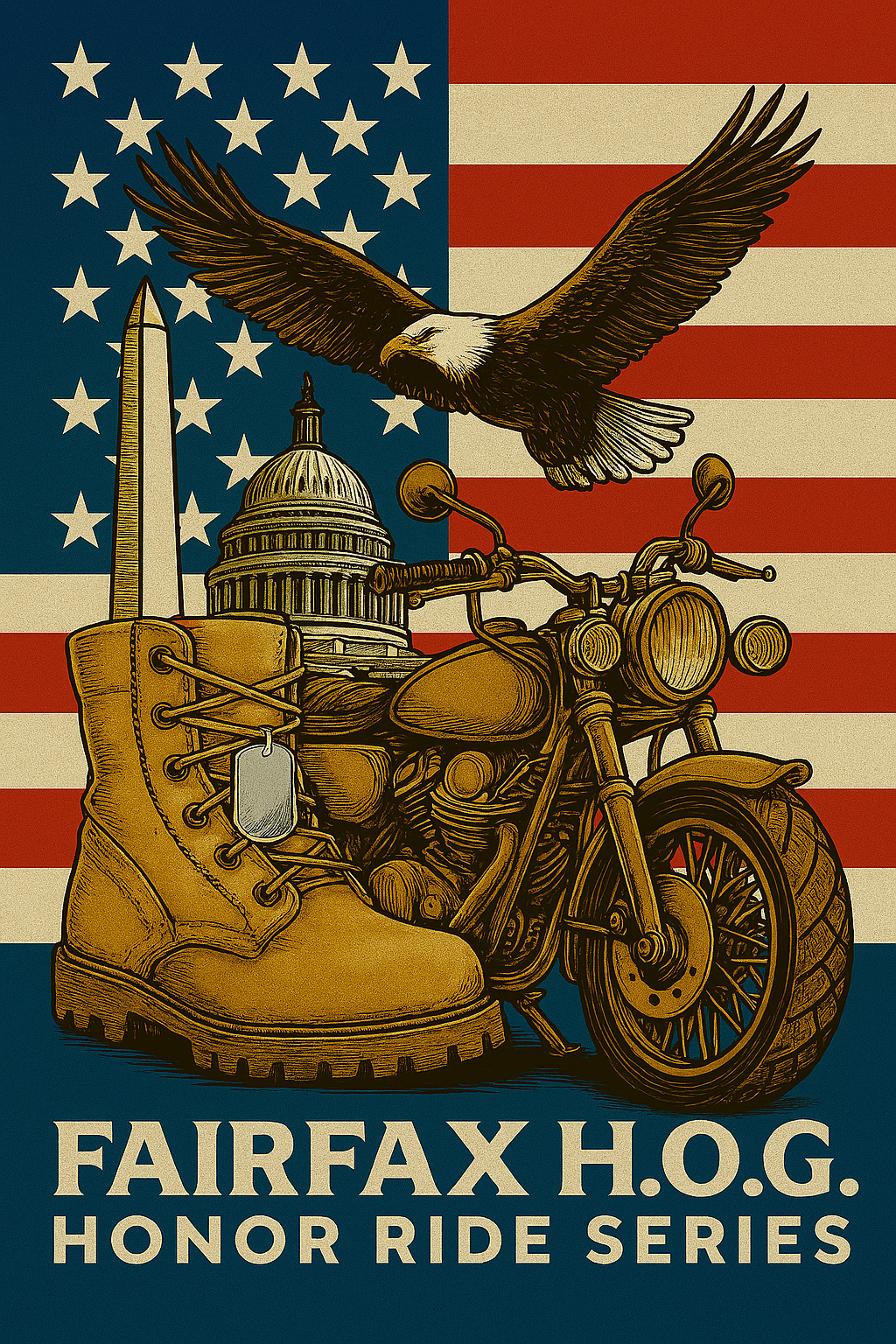 Fairfax H.O.G. has a variety of ride options each year, many of which take advantage of Fairfax's geographic proximity to a multitude of interesting destinations and exciting excursions. In addition, due to its proximity to historical, traditional, and locations of American legacy, there are even more ways to put together exciting rides. At F.H.O.G., we purposely set out to visit many of this Americana throughout our riding season, but like to have fun with it. Each year, depending on how many honor rides are scheduled, there is a minimum required number of rides to participate in order to be awarded the below patch. That number is communicated to the Chapter members after the Ride Planning Meeting held each January.